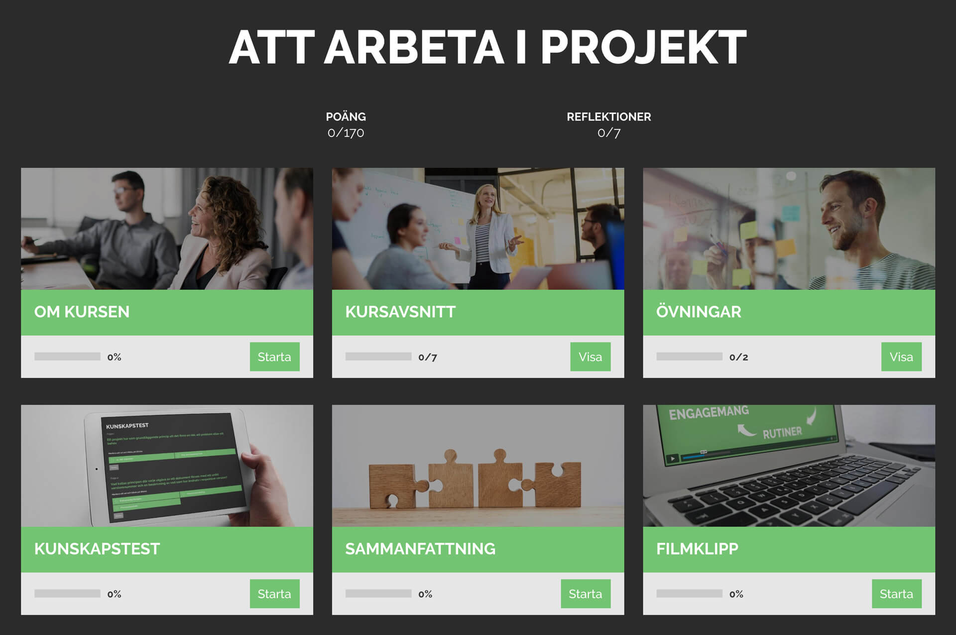 Definitioner av projekt – Projektmål och effektmål – Vanliga fallgropar – Projektets intressenter – Framgångsfaktorer – Projektmodellens användning – Projektets olika faser – Förberedelser innan start – Projektplanens innehåll – Leveranser och aktiviteter – Uppskatta tid – Delegering och uppföljning – Identifiera och hantera risker – Överlämna resultat – Slutrapport och utvärdering