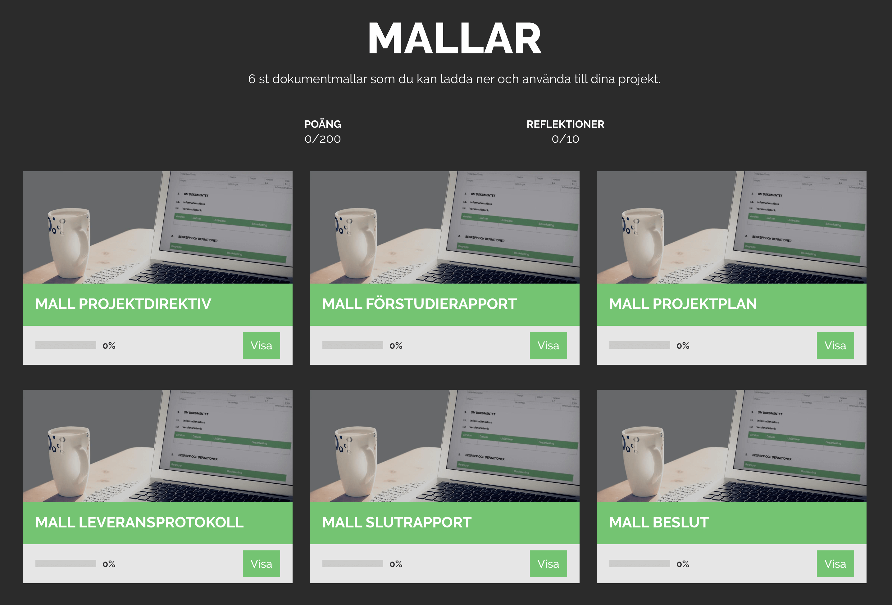 Vi har valt ut de mest centrala dokumentmallarna som du som projektledare behöver. I kursavgiften ingår en enanvändarlicens för följande mallar: Projektdirektiv, Projektplan, Förstudierapport, Leveransprotokoll, Slutrapport och Beslutsdokument.
